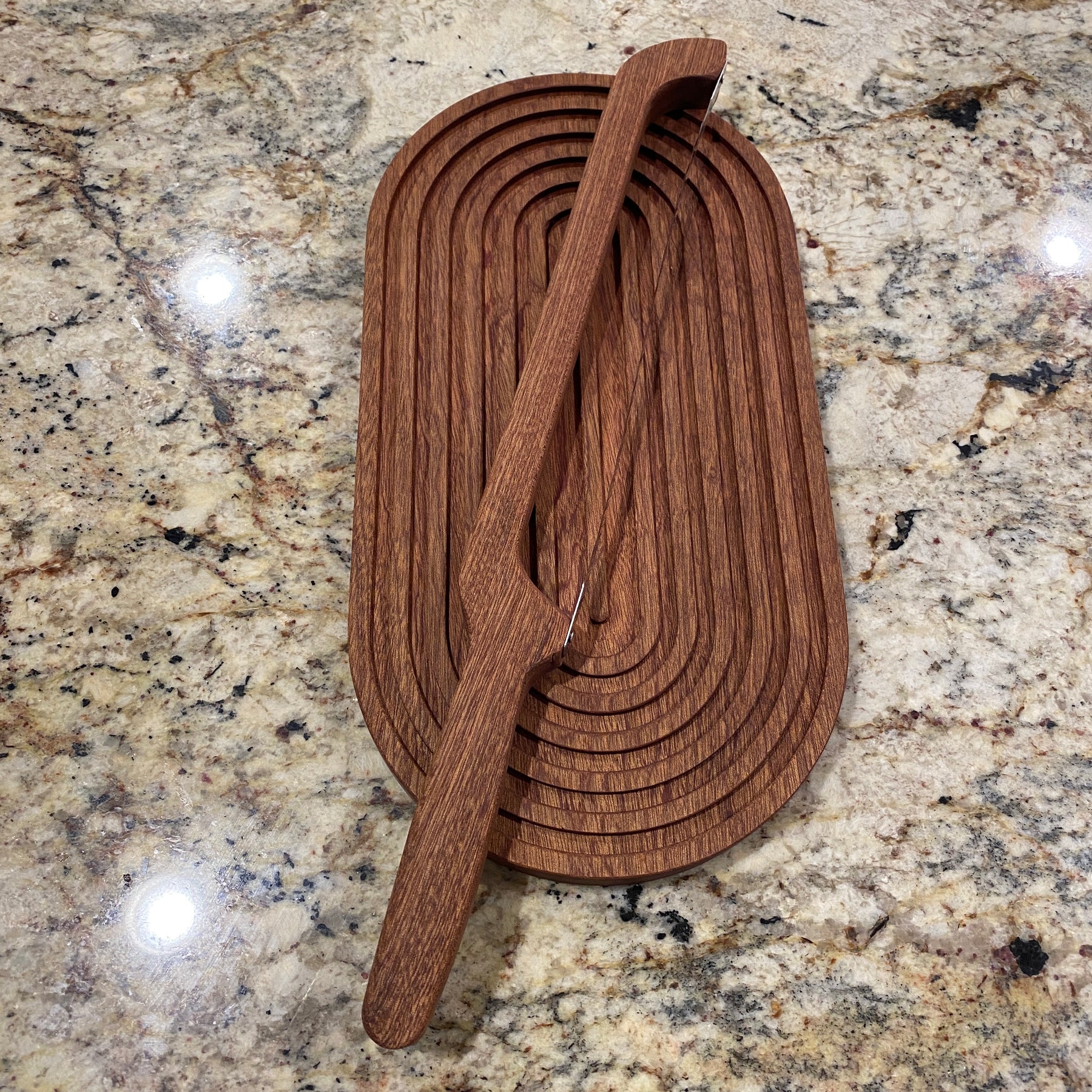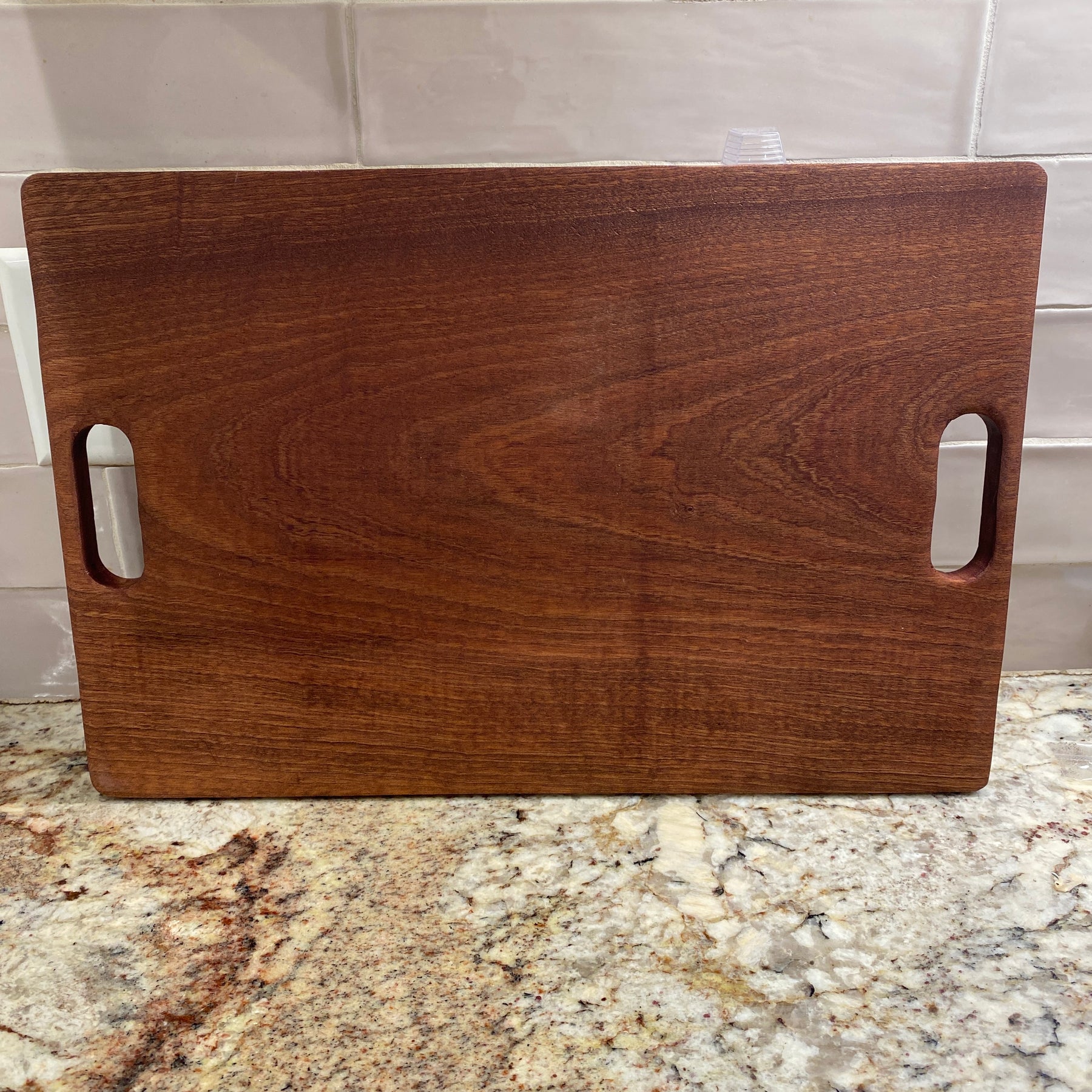 Elevate everyday cooking with this handmade 18 x 12 Sapele cutting board, designed as a reversible workhorse for your kitchen. One side features a precision-cut juice groove and integrated handles, perfect for carving brisket, steaks, or roasts while keeping counters clean. Flip it over for a flat, groove-free surface ideal for chopping vegetables, slicing bread, or serving charcuterie. Crafted on a CNC machine for clean lines, each board is hand sanded silky smooth to showcase the rich reddish-brown grain of Sapele hardwood. Treated with food-safe mineral oil, it is ready for immediate use and easy to maintain with occasional re-oiling. Priced at $75, this board makes a standout gift for home cooks, grill masters, and anyone who appreciates high-quality Louisiana-made craftsmanship.